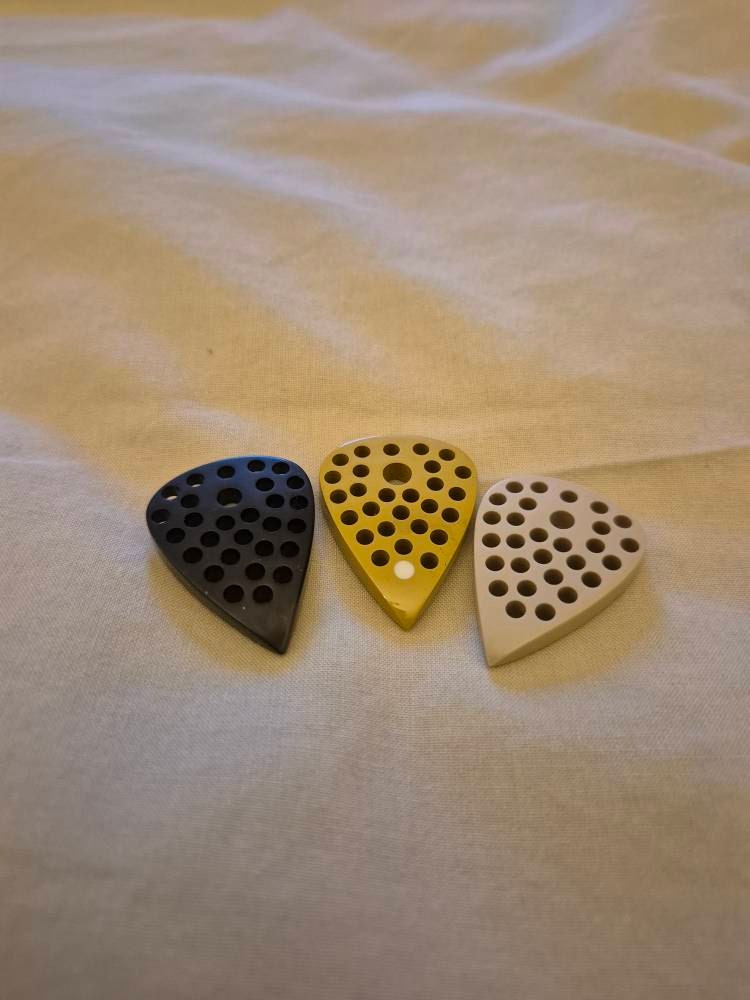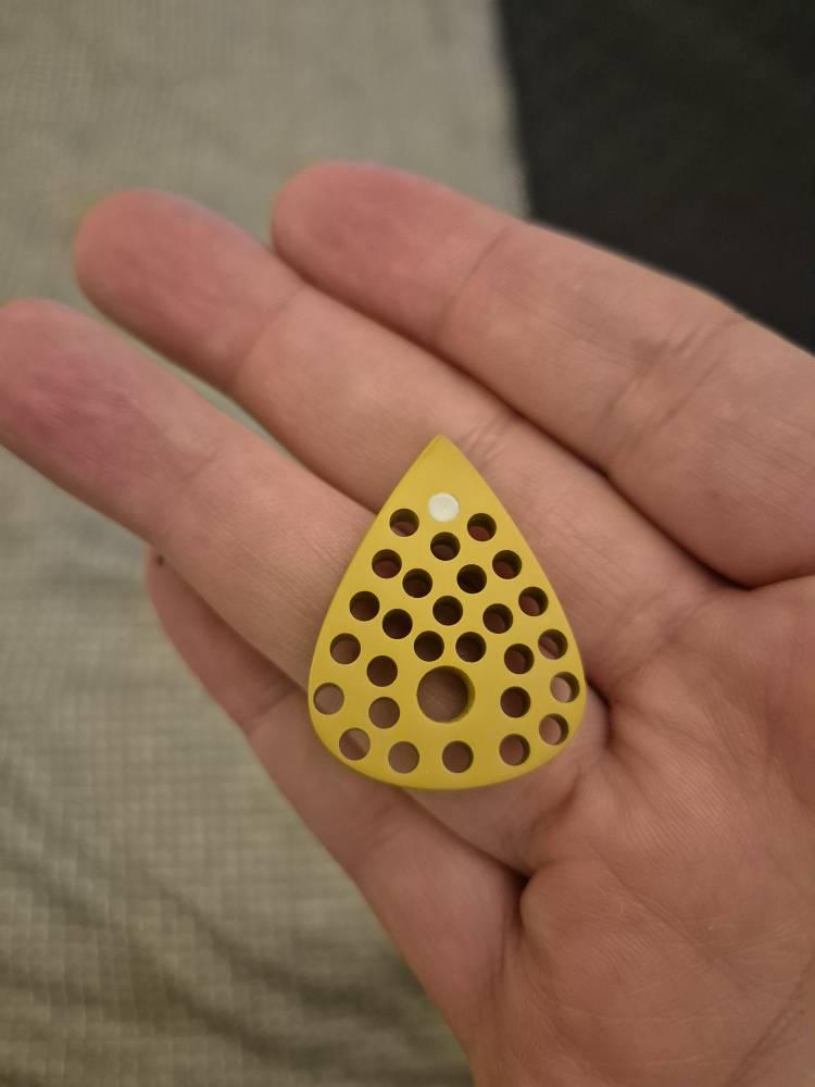 Very comfortable, light and durable handmade modern guitar pick made of high quality peek & torlon with drilled holes and glow-in-the-dark material in the front part near the tip. Thanks to the drilled holes on the entire surface, it was possible to reduce the weight to a minimum, making this plectrum one of the lightest in its overall size class.